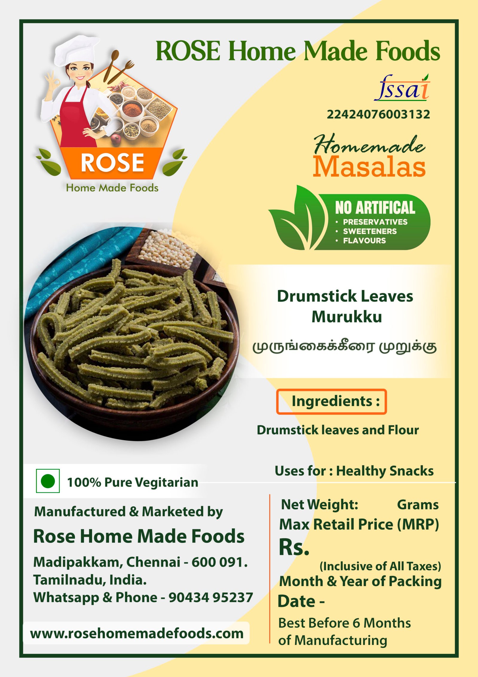 Drumstick Leaves Murukku is a crispy, savory snack infused with the goodness of drumstick leaves. Perfect for tea-time or as a crunchy treat, it offers a flavorful, healthy option for all ages.